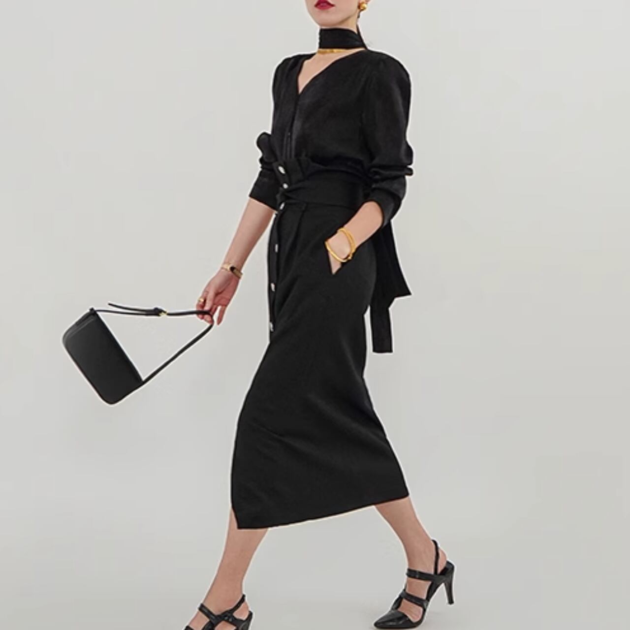 上品で洗練された印象を与える長めの丈感。カジュアルからフォーマルまで幅広く対応可能です。