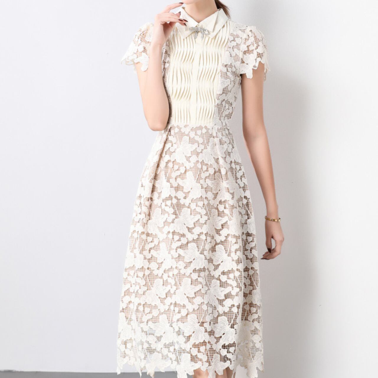 華やかなフラワーレースが特徴のドレス。特別なイベントやデート、普段のお出かけにもぴったりなアイテムです。 レース素材が繊細な印象を与え、女性らしさを一層引き立てます。