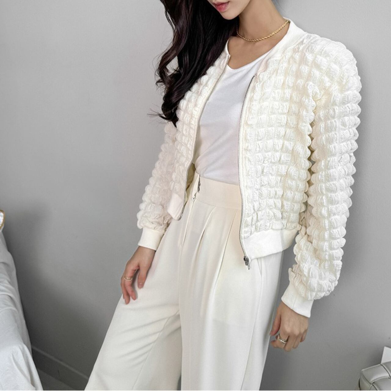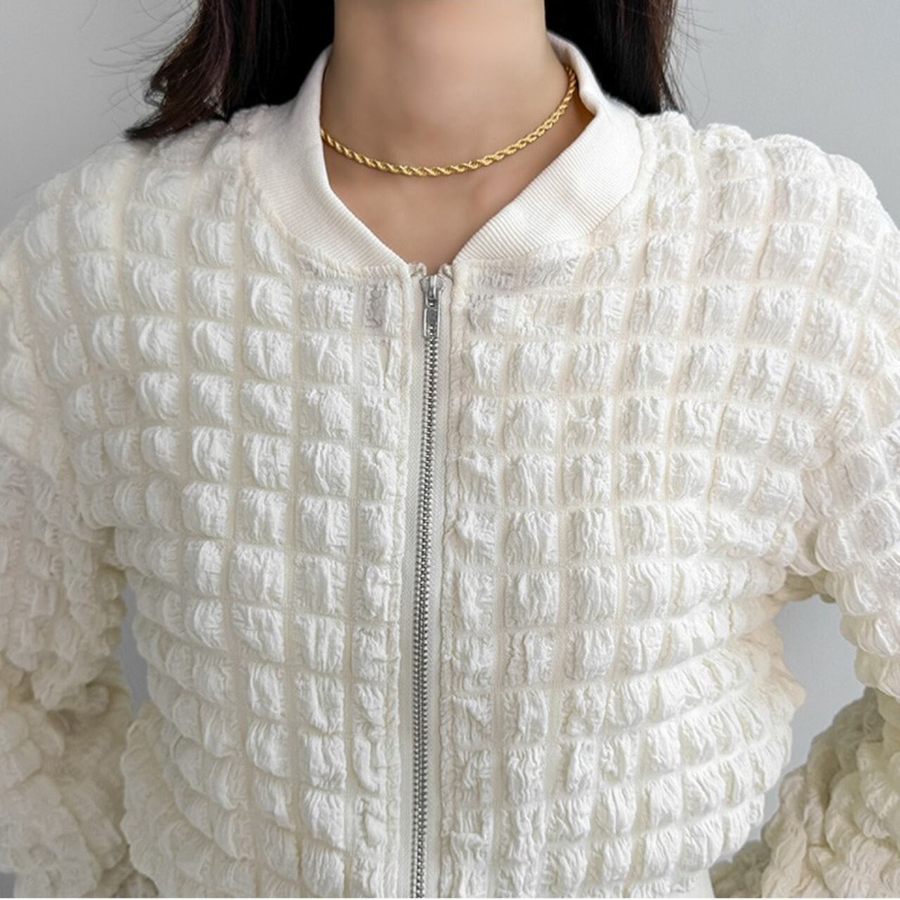ふっくらとしたワッフル生地が独特のテクスチャーを生み出し、カジュアルながらもおしゃれな雰囲気を演出します。ジップアップデザインは着脱が簡単で、さまざまなスタイルに対応可能です。