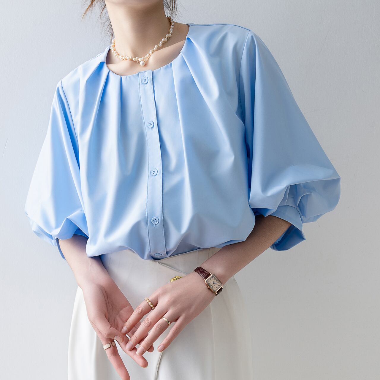 軽やかなパフスリーブが特徴的なブラウス。柔らかなシルエットが女性らしい印象を与え、デイリーユースから特別なシーンまで幅広く対応できるアイテムです。シンプルなボトムスとも相性抜群で、華やかさを演出します。