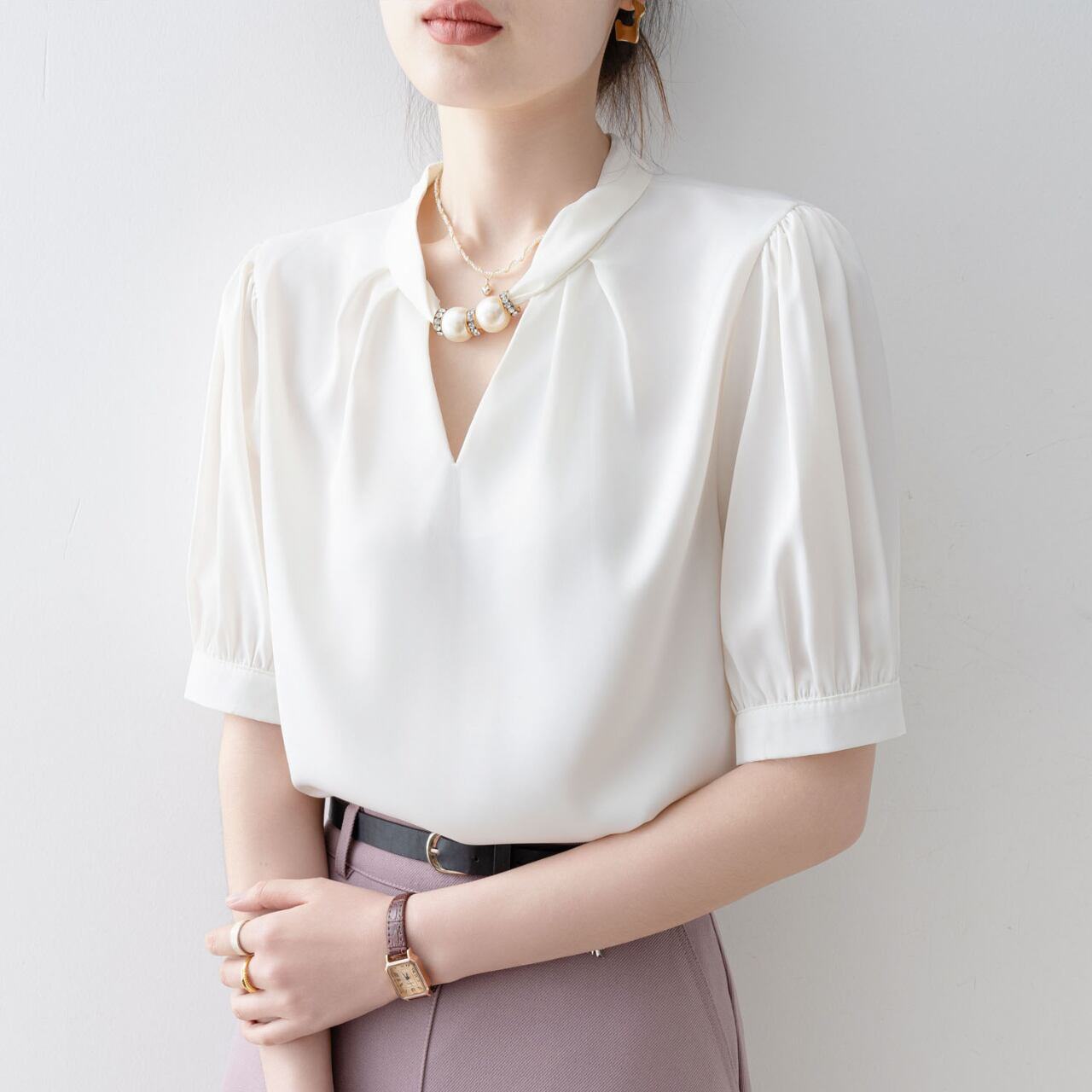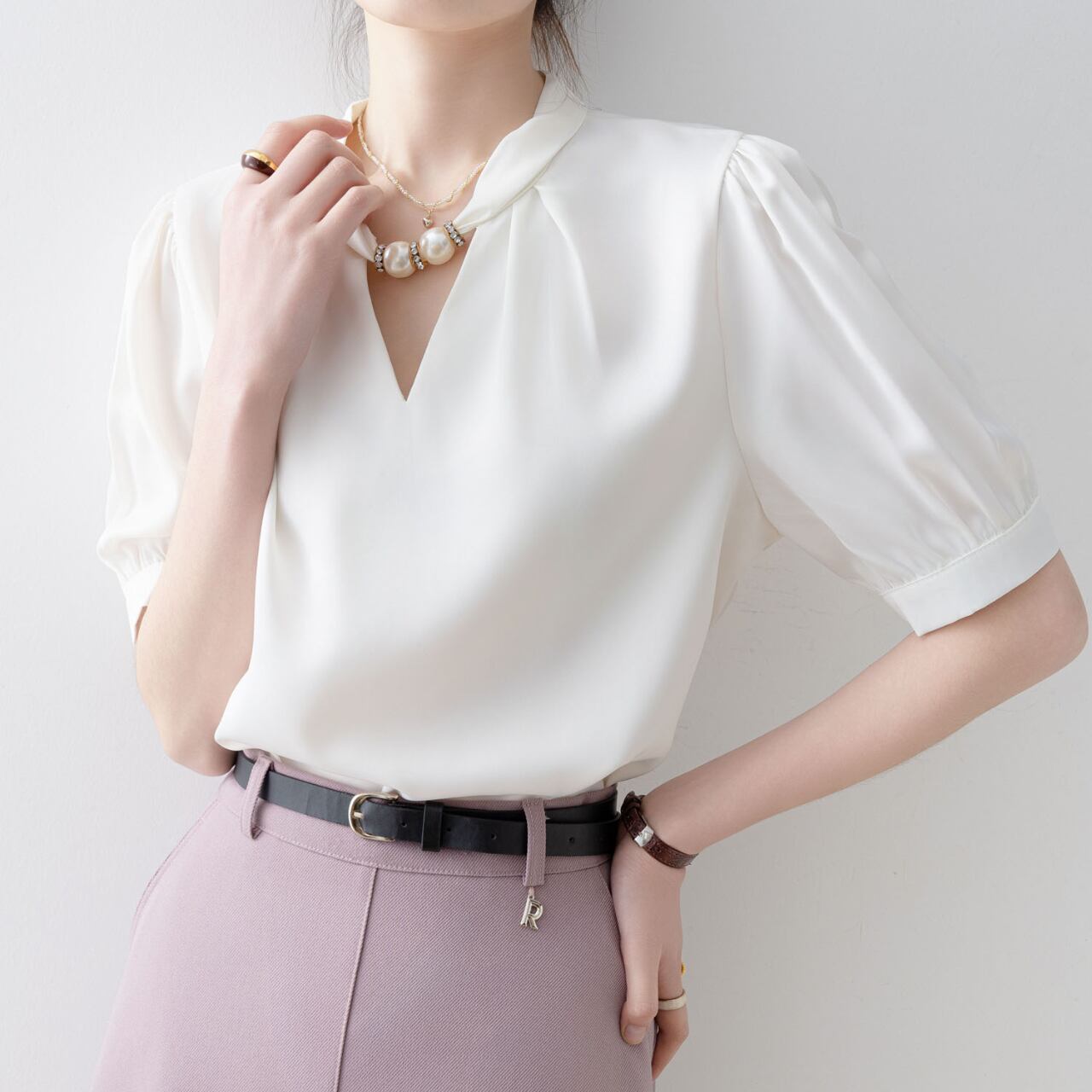 パールビジューボタンが煌めく魅力的なブラウス。華やかな印象を与えつつ、カジュアルなデニムスタイルやエレガントなスカートとのコーディネートが可能で、幅広いシーンで活躍する一着です。特別な日常やお出かけにもぴったりで、コーディネートを楽しむことができます。