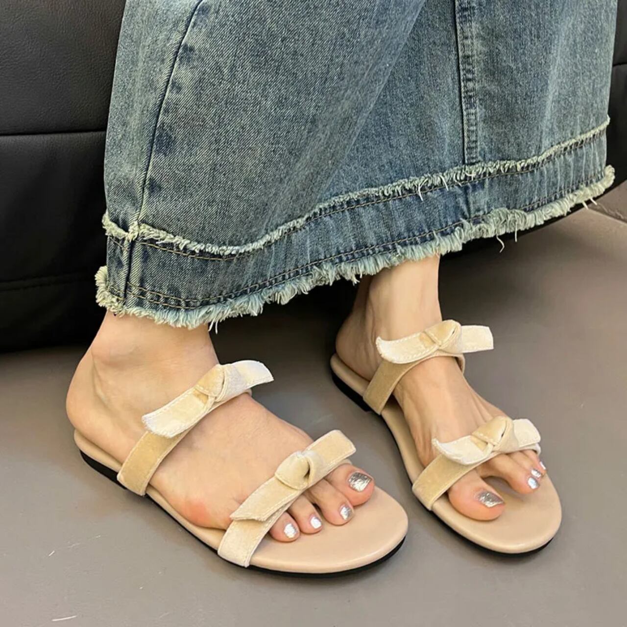 大きめのリボンが足元を華やかに演出する、可愛さと快適さを兼ね備えた一足。