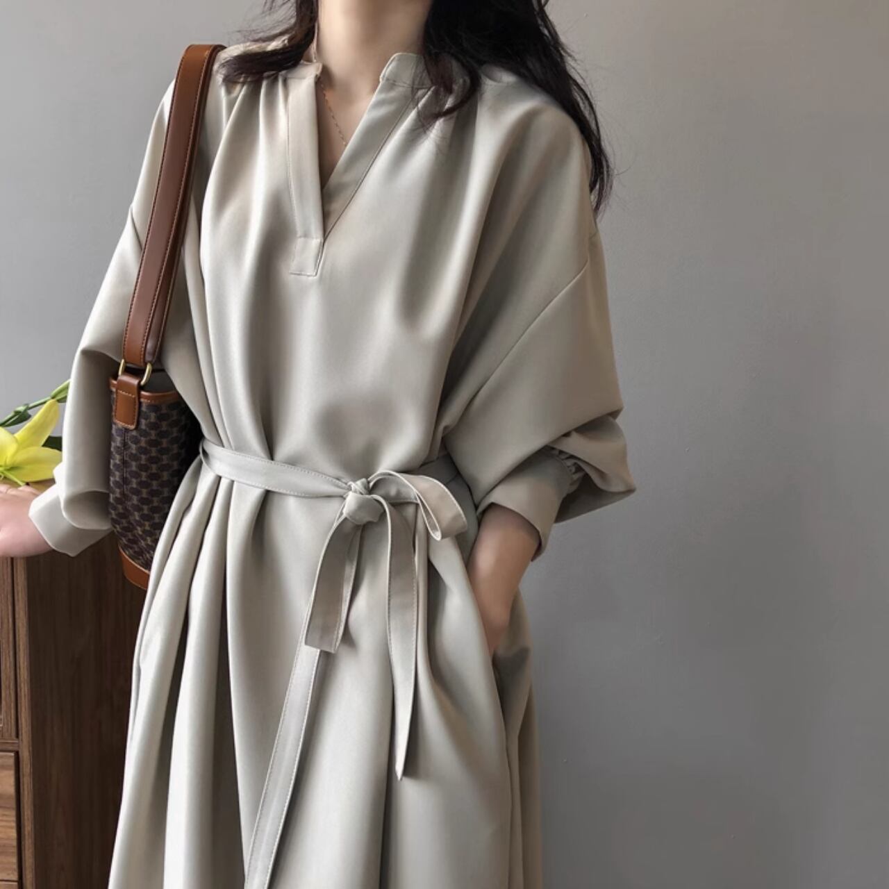 Vネックロングワンピースは、優雅なシルエットと程よいフィット感が魅力の一着です。ベルト付きで、ウエストを引き締めることでスタイルアップを実現し、どんなシーンでも自信を持って着こなせます。柔らかな素材感が肌に優しく、日常使いからちょっとしたお出かけまで幅広くご活用いただけるアイテムです。長めの着丈は、女性らしい印象を与え、涼しげな袖口のデザインが動くたびに華やかさをプラスします。