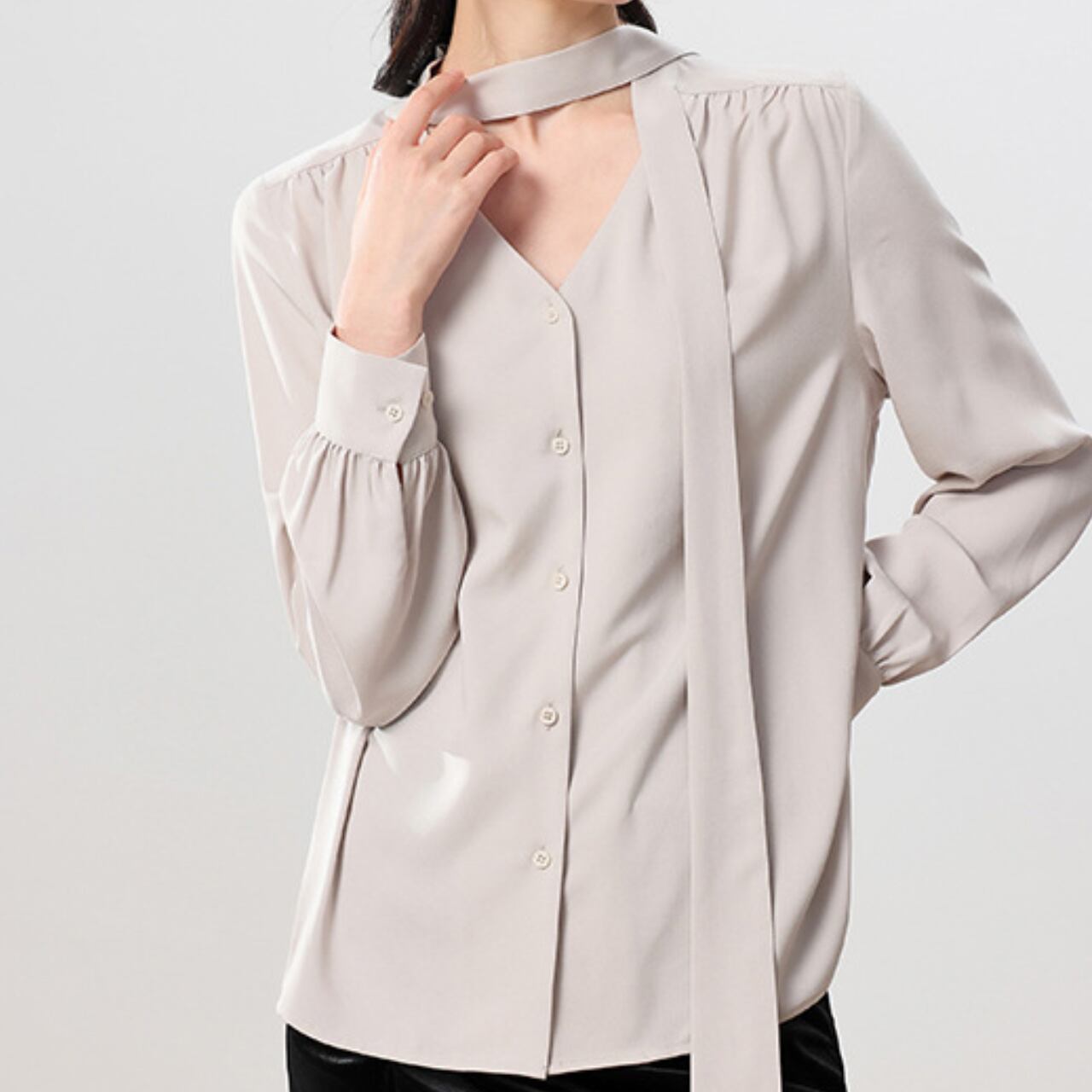 スタイリッシュでエレガントな印象を持つリボンタイブラウスです。フェミニンなデザインでありながら、シンプルさも併せ持つため、デイリーユースにも特別なシーンにもぴったりです.