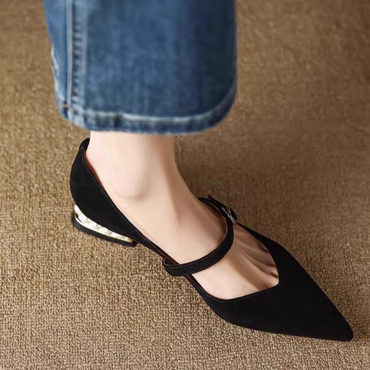 ポインテッドトゥのシルエットが女性らしさを引き立て、シンプルながらもエレガントな佇まいで、さまざまなスタイルに合わせやすく、カジュアルからフォーマルまで幅広く活躍します。