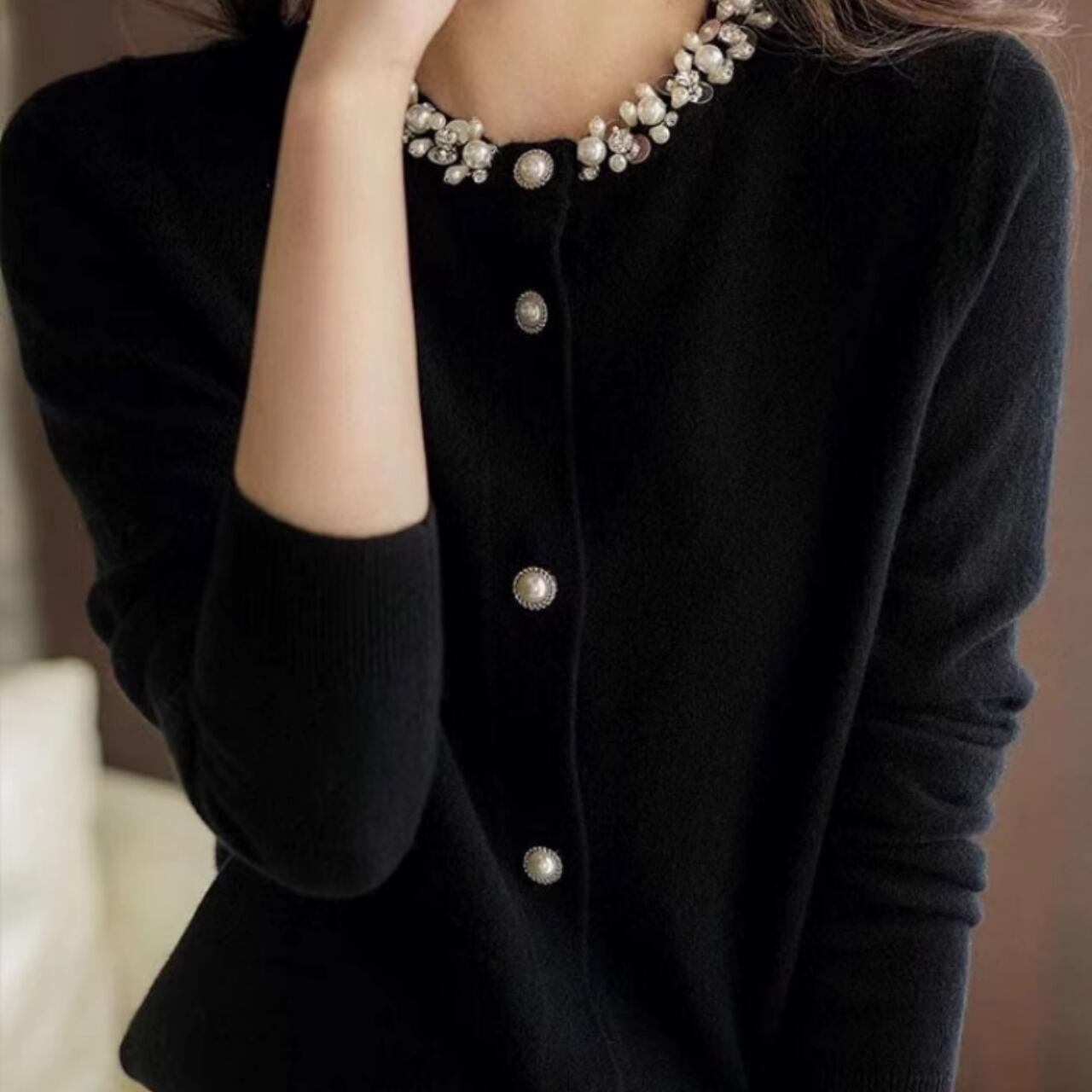 シンプルながらもエレガントな印象を与えるパールのカーディガンです。クルーネックのデザインはどんなトップスにも合わせやすく、デイリーユースからオフィスシーンまで幅広くお楽しみいただけます。パールのアクセントが華やかさを引き立て、コーディネートのポイントに最適です。