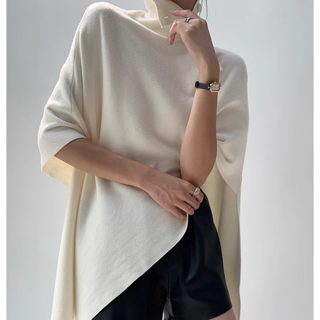 ユニークなショールケープデザインは、ハイネックで首元を温かく包み込み、優雅なシルエットを演出します。シンプルなスタイルながら、特別な日からカジュアルな日常使いまで幅広いシーンで活躍します。着心地も抜群で、どんなコーディネートにも合わせやすいアイテムです。