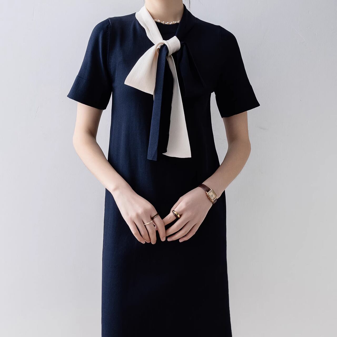 洗練されたバイカラーのデザインが特徴的なワンピースです。シンプルながらもスタイリッシュで、カジュアルな日常使いはもちろん、特別な日のコーディネートにもぴったりです。胸元にあしらわれたリボンが、さりげなく女性らしさを演出しています。自信を持てるシルエットが魅力の一着です。