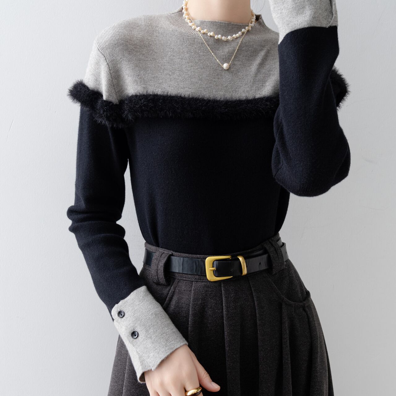 優雅なファー付き切り替えデザインが魅力のニットです。異なる素材を巧みに組み合わせることで、上品で洗練された印象を与え、さまざまなシーンで活躍します。シンプルながらも存在感のあるこのニットは、どんなコーディネートにも合わせやすく、おしゃれを楽しむための素敵なアイテムです。