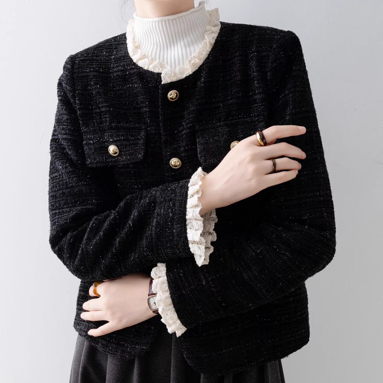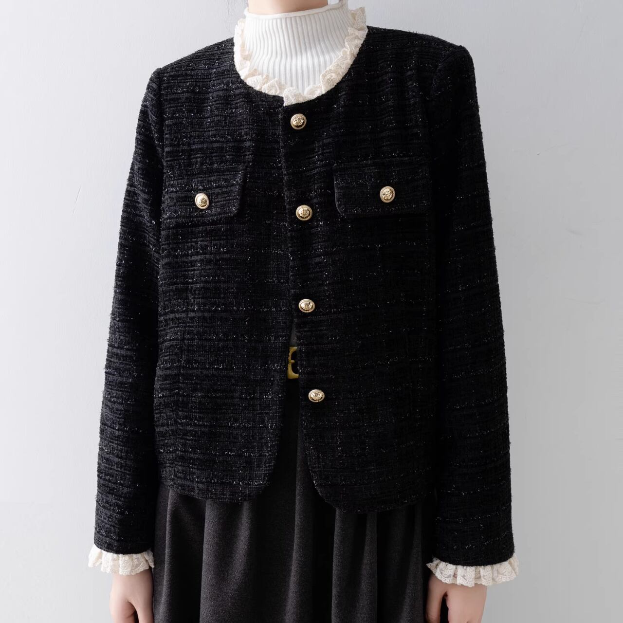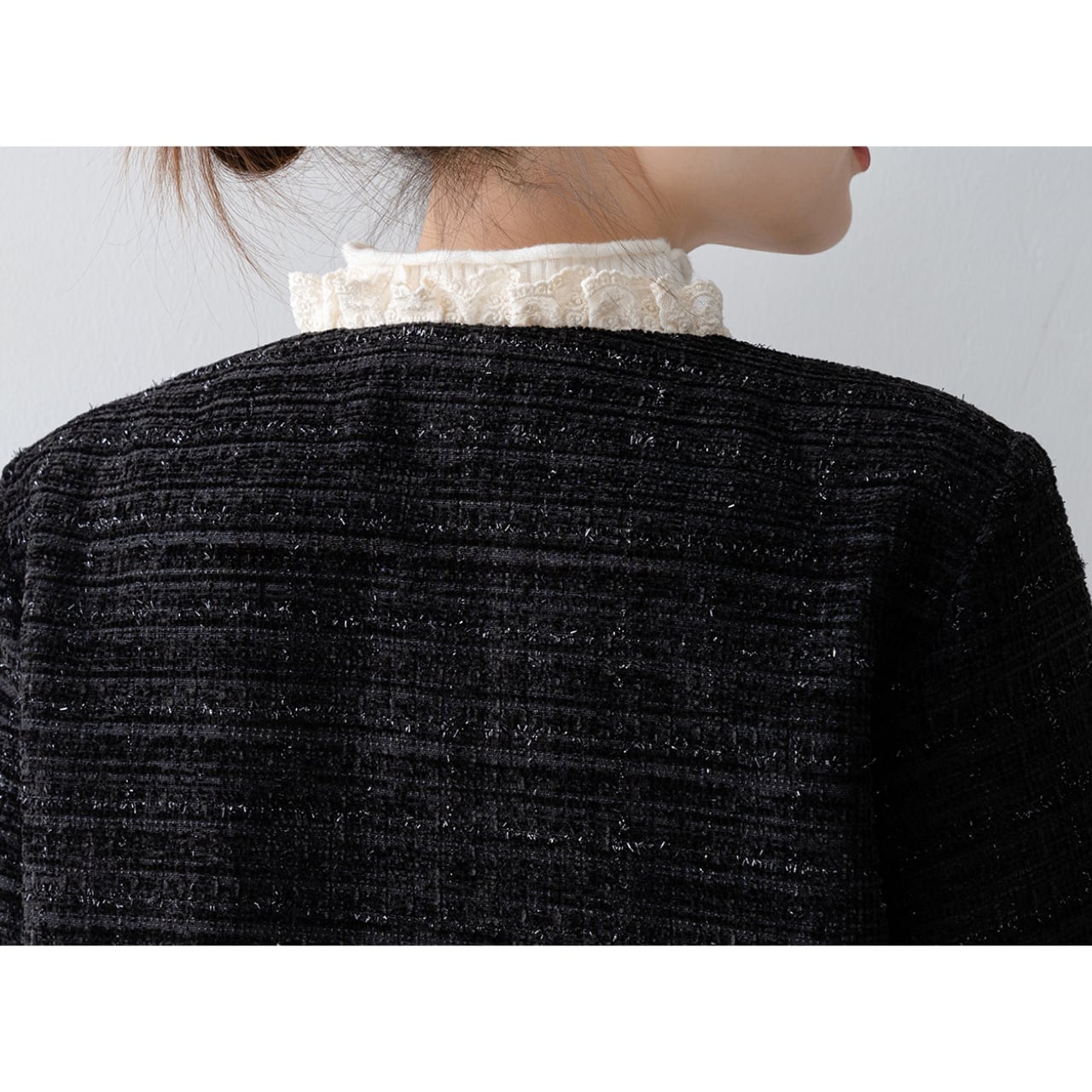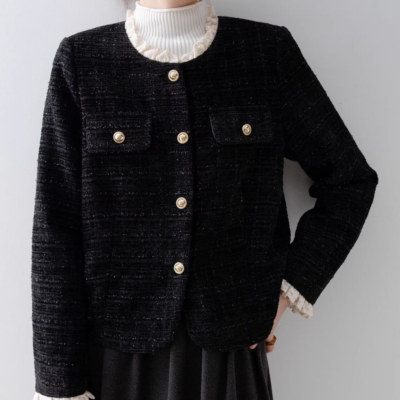 洗練された魅力を感じさせるジャケットです。エレガントなレースデザインが特徴で、カジュアルなシーンから特別な日のおしゃれまで幅広く対応します。アクセントを加えることで、コーディネートを一層引き立てるアイテムです。