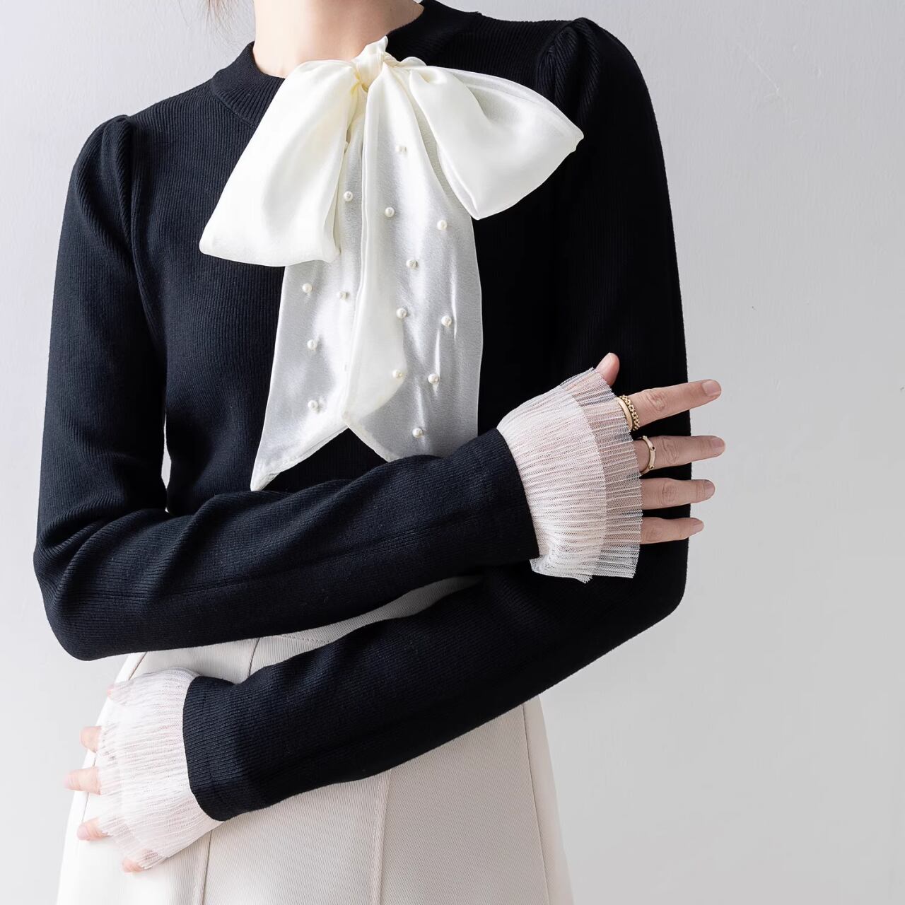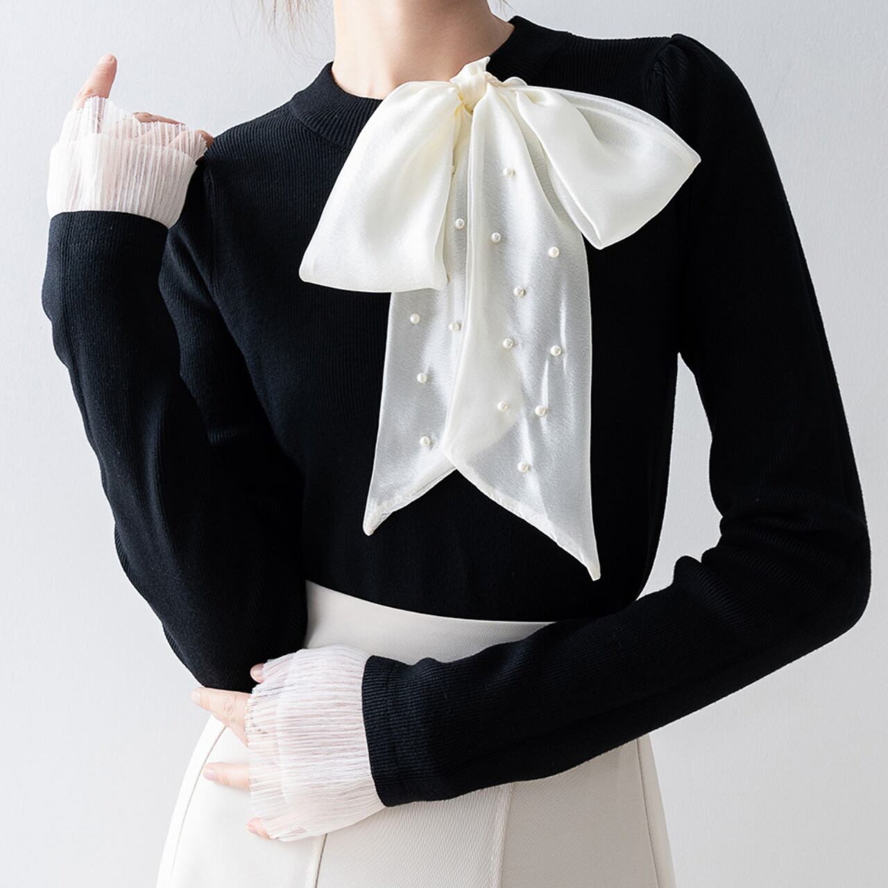 パールがあしらわれたボウタイデザインが華やかさを引き立て、フリル袖がフェミニンな印象を与えます。特別なシーンにはもちろん、デイリーユースにも最適で、様々なコーディネートにお使いいただける versatility を兼ね備えています。