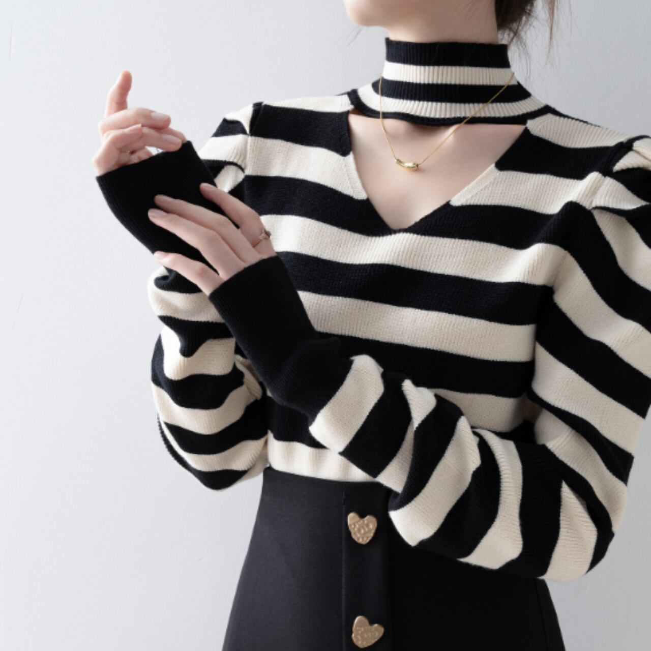 チョーカーカラーとストライプデザインが融合し、軽やかさと同時にエレガントな雰囲気を演出します。カジュアルなシーンからビジネスシーンまで、幅広いコーディネートにマッチする versatile な一着です。柔らかいニット素材による快適な着心地が、日常のスタイルを優雅に引き立ててくれることでしょう。