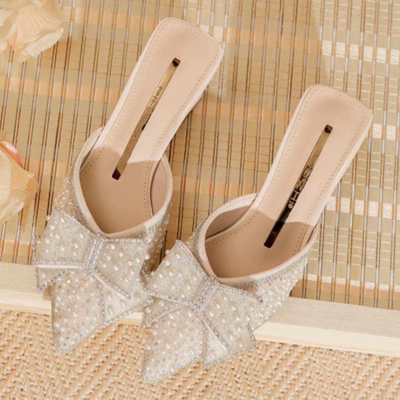 洗練されたラインストーンが煌めくパンプスは、華やかさと快適さを兼ね備えた一足です。リボンデザインが可愛らしさを引き立て、カジュアルからフォーマルなシーンまで幅広くお使いいただけます。特別な日にはもちろん、普段のお出かけにもぴったりのアイテムです。