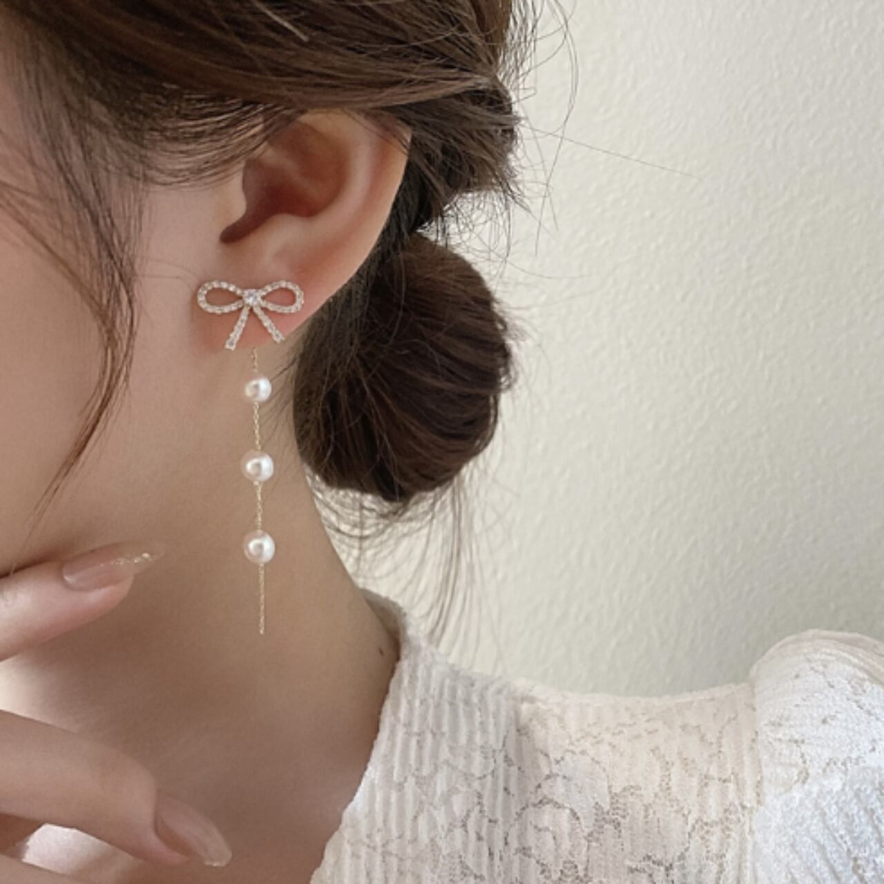 華やかさと洗練を兼ね備えたピアスです。独特のロングボウニッチデザインとタッセルの動きが、耳元を優雅に演出します。パールの輝きが加わることで、シンプルながらも存在感を放ち、あらゆるスタイルにマッチします。
