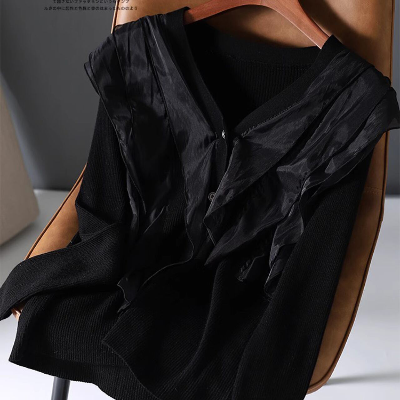洗練されたVネックとフリルデザインが魅力のカーディガン。カジュアルな日常からオフィススタイルまで幅広く活躍するスタイリッシュなアイテムです。フリルのディテールが、あなたのコーディネートを一層華やかに引き立てます。