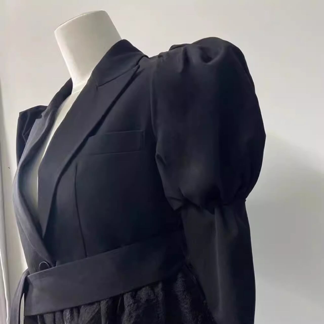 エレガントなジャケットスタイルとフェミニンなフリルデザインが融合した、上品なシルエットと洗練されたディテールで、特別な日やフォーマルな場面にもぴったりの一着です。
